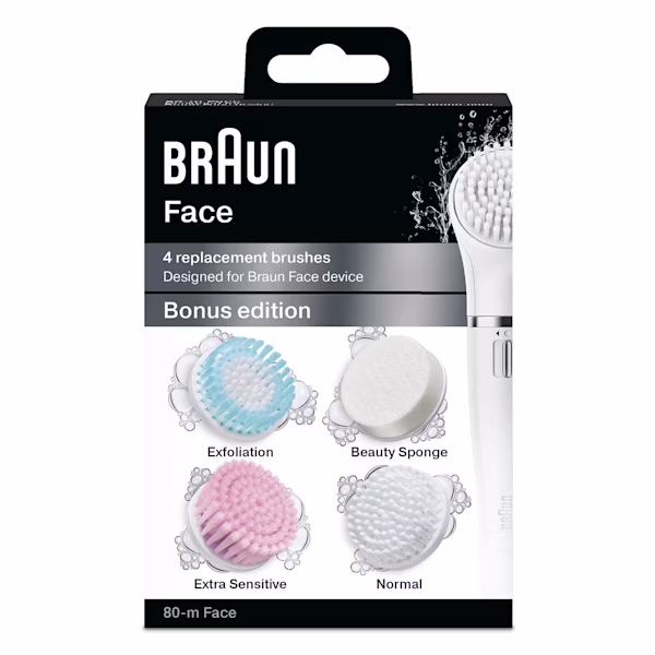 Braun gezichtreinigingsroutine met 4 borstels voor de gecombineerde huid. De Braun Face Bonuseditie bevat 4 verschillende borstels om in al uw huidverzorgingsbehoeften te voorzien en biedt een complete en grondige huidverzorgingsroutine. De normale borstel, de extra gevoelige borstel, de exfoliatieborstel en de Beauty Spons zijn inbegrepen.