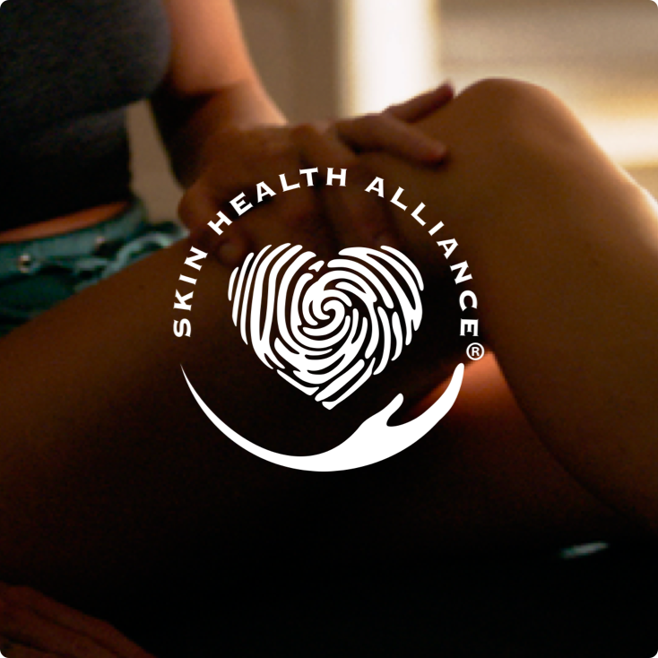 Een gouden Skin Health Alliance-logo met een hart en hand met vingerafdruk.